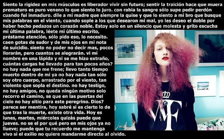 No estoy muerta, estoy viva. Puedo controlar mi vida, pero no mi muerte. Cuarenta Rivotriles y una botella de vino blanco me iban a matar. Me acosté pensando que no me iba a volver a despertar jamás. Escribí todas las paredes con mensajes, escribí cartas para todos. No quiero que se sientan mal, yo me moría feliz. Yo quería que todo fuera perfecto.